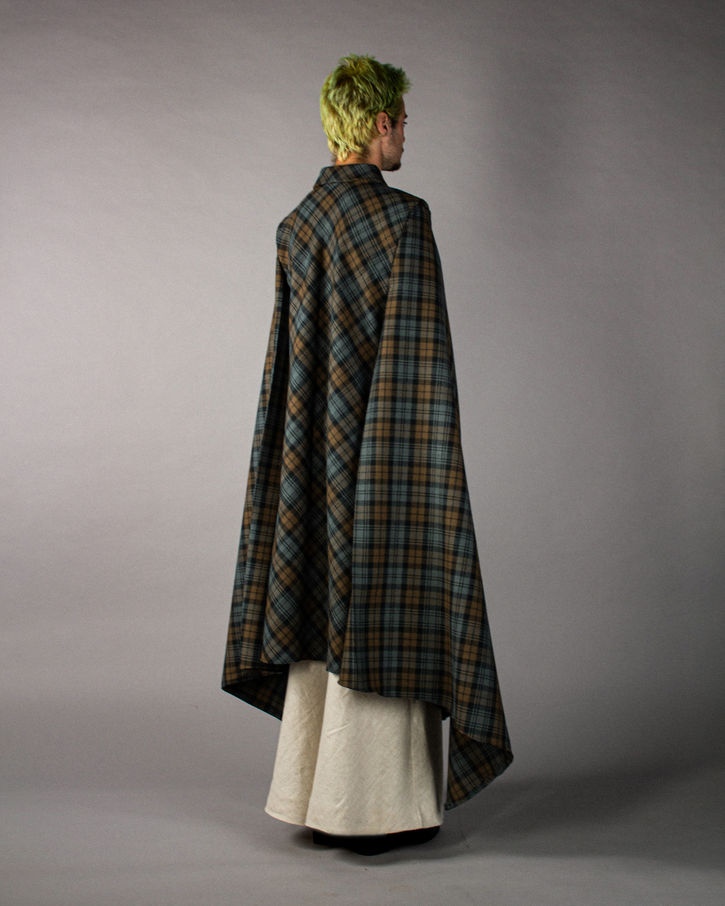 BIAS-CUT COAT-CAPE HYBRID IN LOCHCARRON WOOL TARTAN | BIAS-CUT CROP TOP IN PURE LINEN I BIAS-CUT TROUSERS IN PURE LINEN | BELT IN MELTON WOOL WITH REPURPOSED DRESS SEPARATOR BUCKLE
